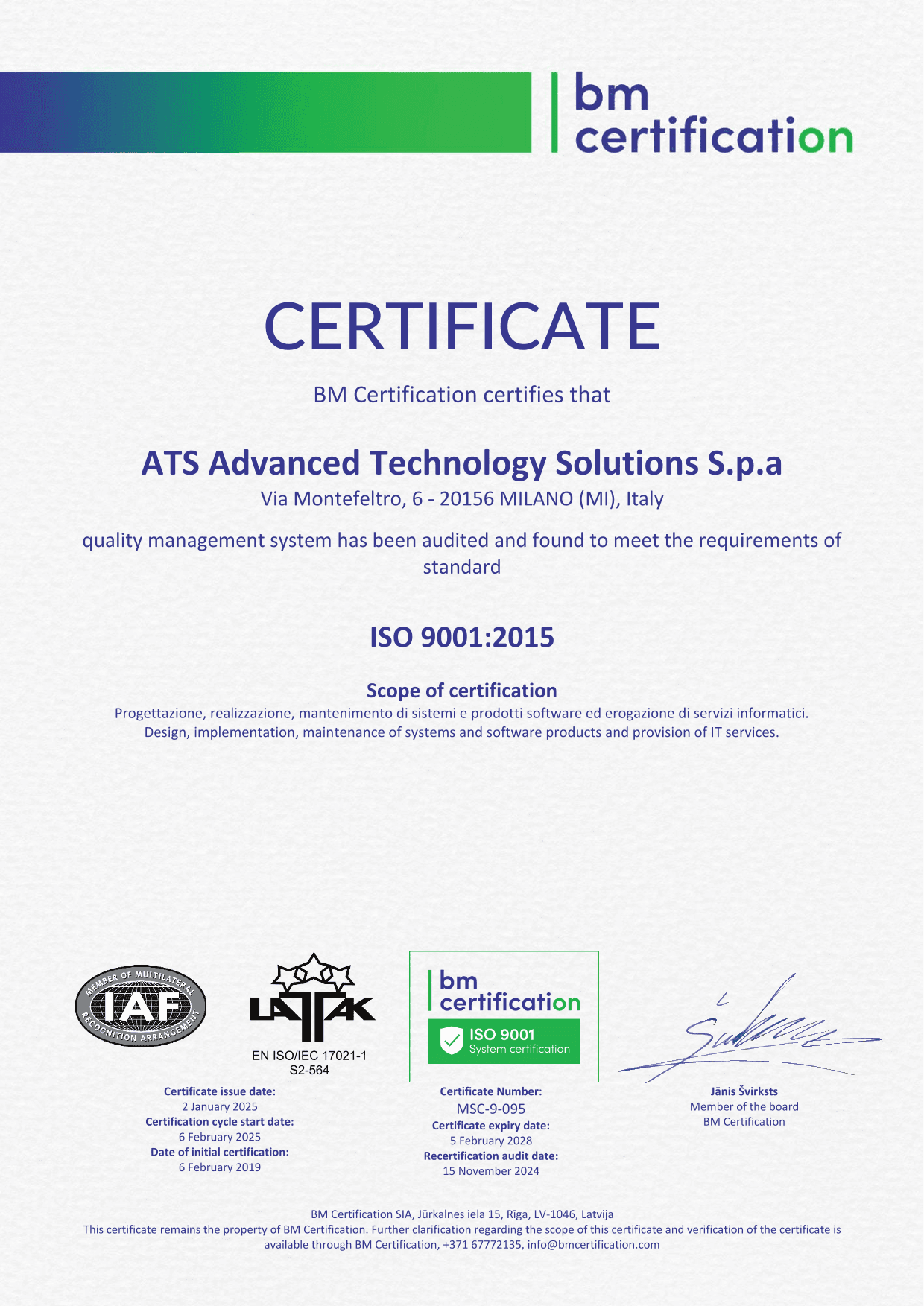 During 2012, ATS has established its own information security management system (ISMS) set according to the dictates of ISO 27001: 2013, and obtained the first certification in 2013. In 2018 ATS implemented the new version of the ISO 9001: 2015 standard.